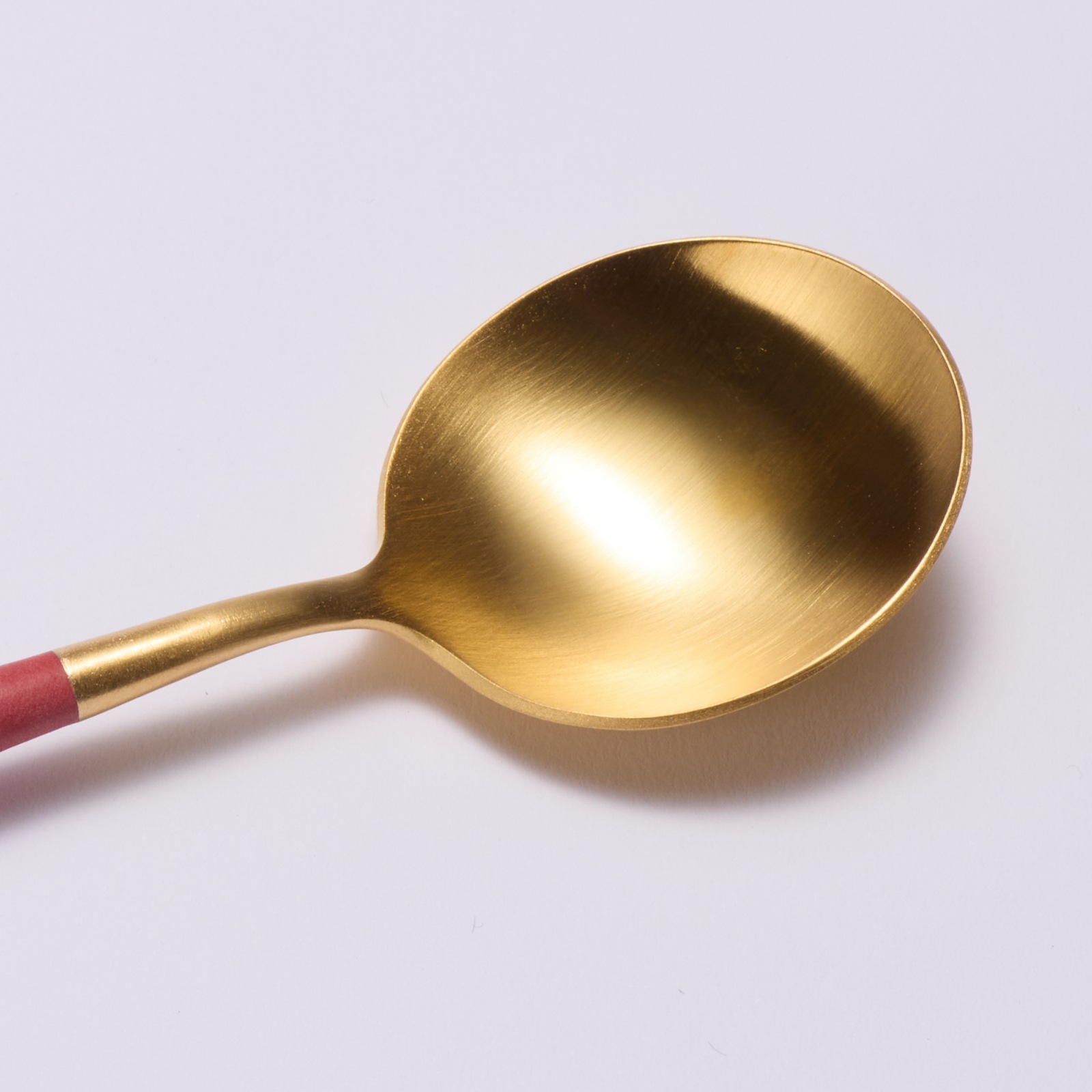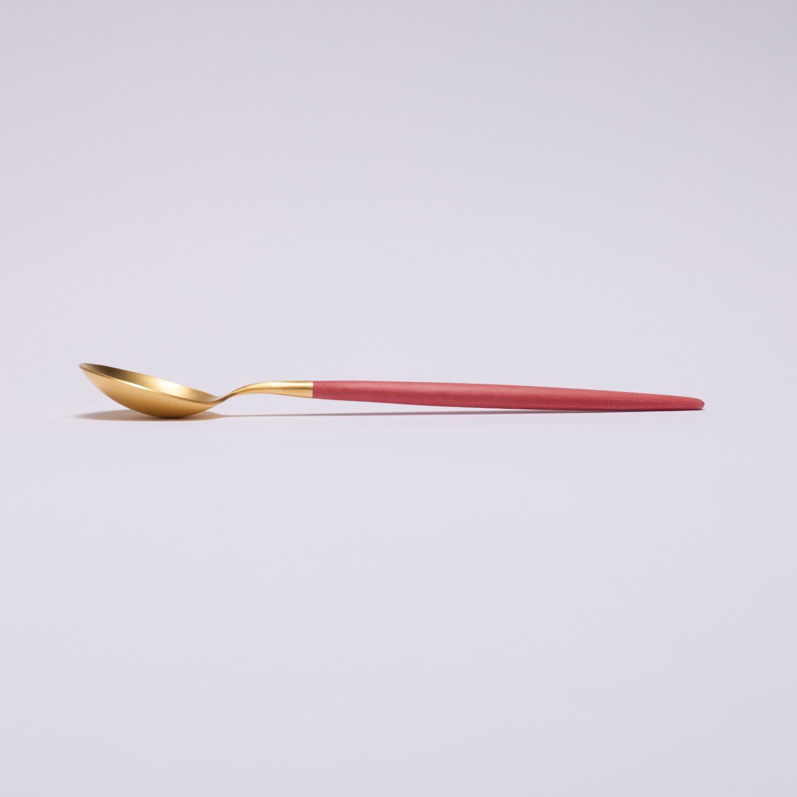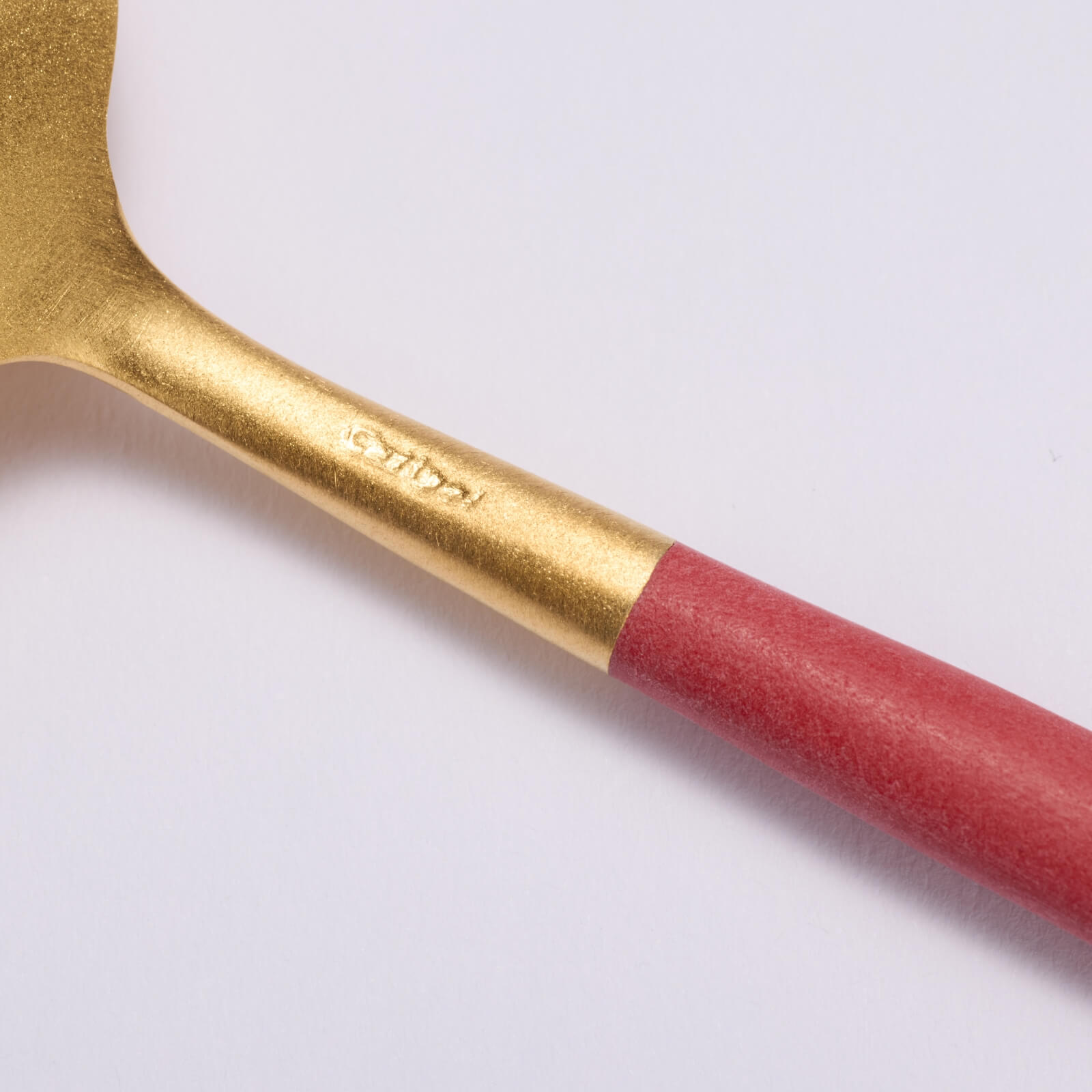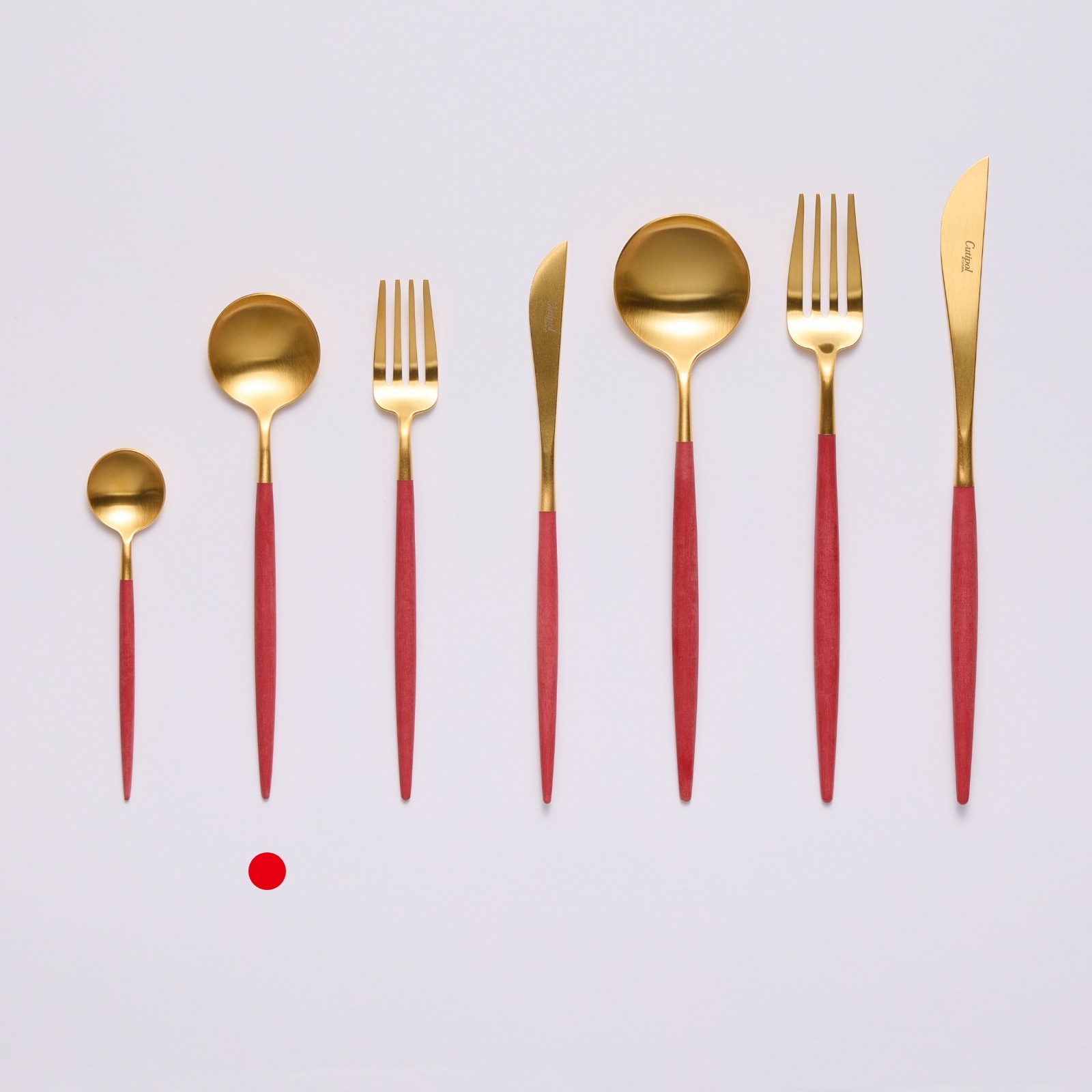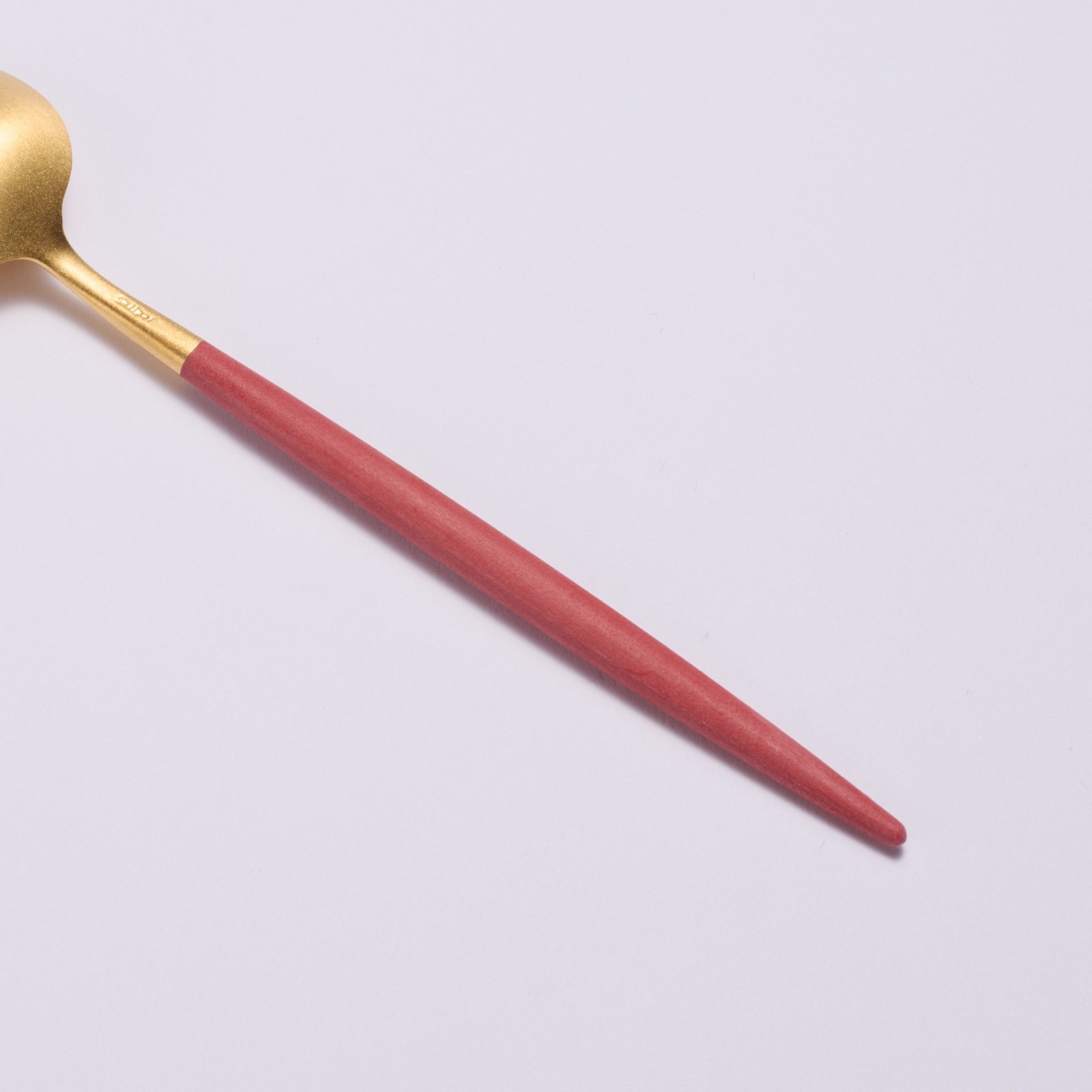 光沢を抑えたゴールドカラーのステンレス、ハンドル部分のレッド樹脂の異なる素材の組み合わせのバランスと繊細なフォルムが仕上げまで職人の手で一本一本作られています。サイズ:全長178mm材質:18-10ステンレス、樹脂生産者:ポルトガル・クチポール社生産国:ポルトガル*弊社で取り扱いのクチポールカトラリーは全て国内正規販売商品です。
